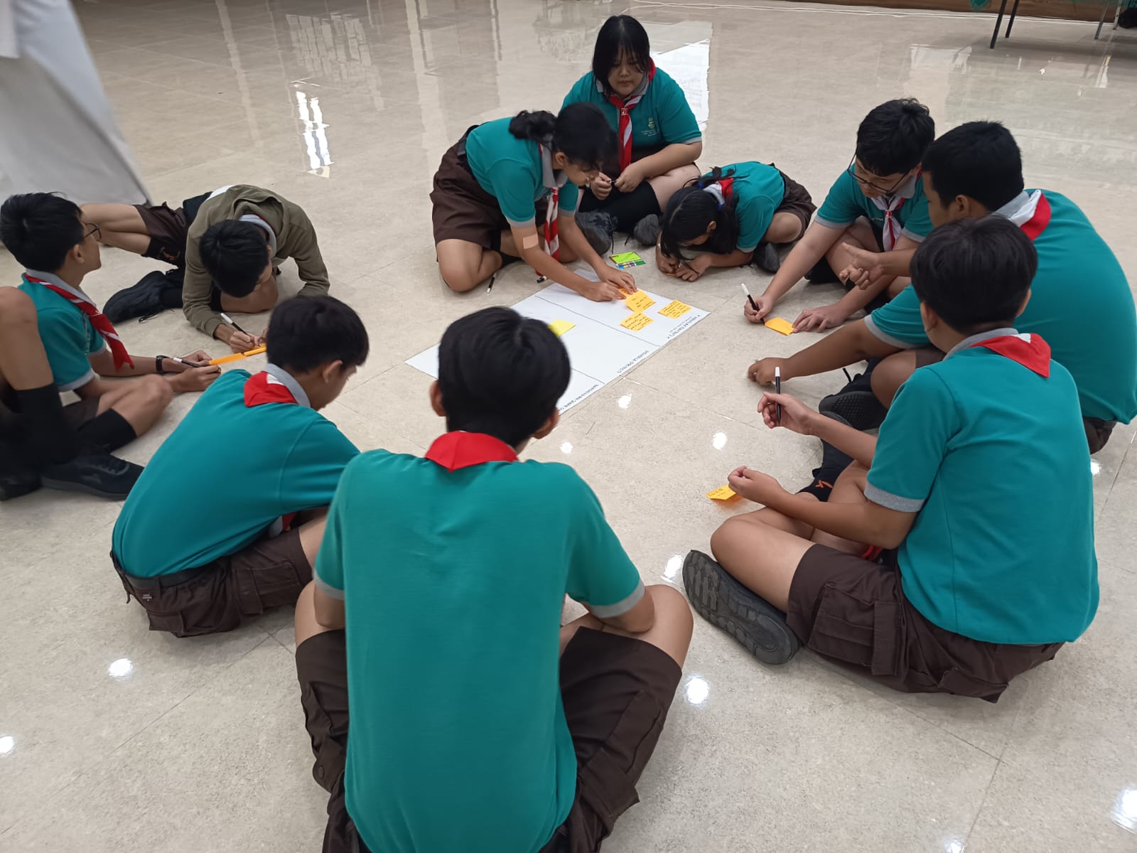 Setelah menonton video, siswa dibagi ke dalam beberapa kelompok untuk berdiskusi. Setiap kelompok diminta menuliskan kata atau kalimat yang berkaitan dengan sikap menolak, membela, dan bertanggung jawab. Melalui kegiatan ini, siswa belajar bekerja sama, menyampaikan pendapat, serta menghargai pemikiran teman.